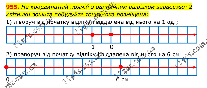 На координатній прямій з одиничним відрізком завдовжки 2 клітинки зошита побудуйте точку, яка розміщена: 1) ліворуч від початку відліку і віддалена від нього на 1 од.; 2) праворуч від початку відліку і віддалена від нього на 6 см.