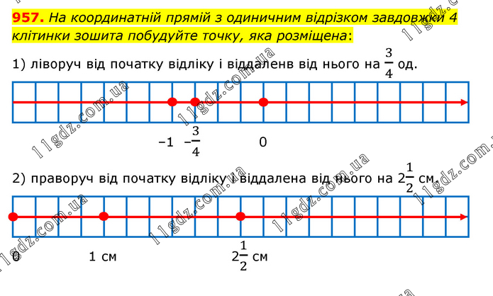 На координатній прямій з одиничним відрізком завдовжки 4 клітинки зошита побудуйте точку, яка розміщена: 1) ліворуч від початку відліку і віддаленв від нього на 3/4 од. 2) праворуч від початку відліку і віддалена від нього на 21/2 см.
