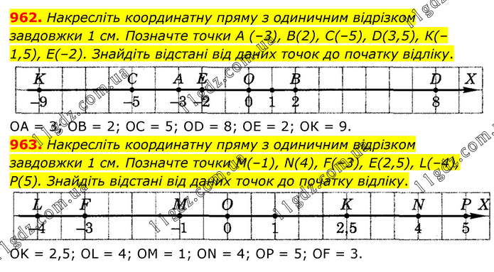 962. Накресліть координатну пряму з одиничним відрізком завдовжки 1 см. Позначте точки А (–3), В(2), С(–5), D(3,5), К(–1,5), Е(–2). Знайдіть відстані від даних точок до початку відліку. ОА = 3; ОВ = 2; ОС = 5; ОD = 8; ОЕ = 2; ОК = 9. 963. Накресліть координатну пряму з одиничним відрізком завдовжки 1 см. Позначте точки М(–1), N(4), F(–3), E(2,5), L(–4), Р(5). Знайдіть відстані від даних точок до початку відліку. OK = 2,5; OL = 4; OM = 1; ON = 4; ОР = 5; OF = 3.