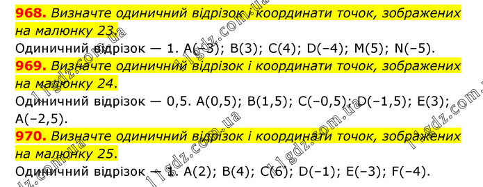 968. Визначте одиничний відрізок і координати точок, зображених на малюнку 23. Одиничний відрізок — 1. А(–3); B(3); С(4); D(–4); М(5); N(–5). 969. Визначте одиничний відрізок і координати точок, зображених на малюнку 24. Одиничний відрізок — 0,5. А(0,5); B(1,5); C(–0,5); D(–1,5); Е(3); А(–2,5). 970. Визначте одиничний відрізок і координати точок, зображених на малюнку 25. Одиничний відрізок — 1. А(2); B(4); С(6); D(–1); Е(–3); F(–4).
