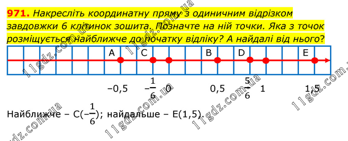 Накресліть координатну пряму з одиничним відрізком завдовжки 6 клітинок зошита. Позначте на ній точки. Яка з точок розміщується найближче до початку відліку? А найдалі від нього? Найближче – С(–1/6); найдальше – Е(1,5).