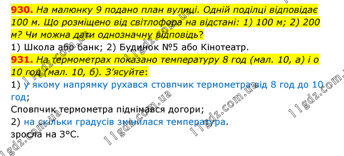 930. На малюнку 9 подано план вулиці. Одній поділці відповідає 100 м. Що розміщено від світлофора на відстані: 1) 100 м; 2) 200 м? Чи можна дати однозначну відповідь? 1) Школа або банк; 2) Будинок №5 або Кінотеатр. 931. На термометрах показано температуру 8 год (мал. 10, а) і о 10 год (мал. 10, б). З’ясуйте: 1) у якому напрямку рухався стовпчик термометра від 8 год до 10 год; Сповпчик термометра піднімався догори; 2) на скільки градусів змінилася температура. зросла на З°С.