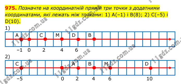 Позначте на координатній прямій три точки з додатними координатами, які лежать між точками: 1) А(–1) і В(8); 2) С(–5) і D(10).
