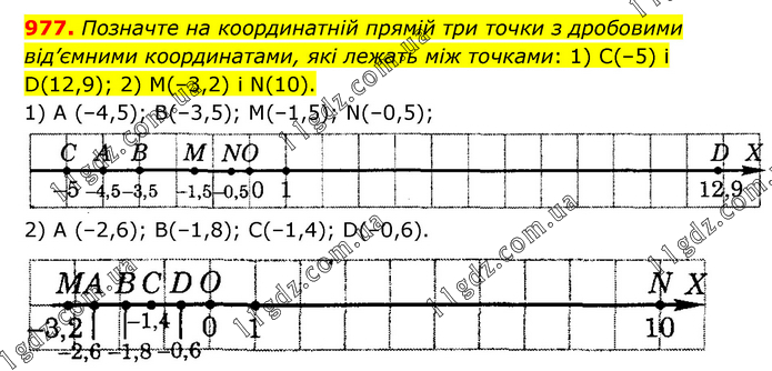 Позначте на координатній прямій три точки з дробовими від’ємними координатами, які лежать між точками: 1) С(–5) і D(12,9); 2) М(–3,2) і N(10). 1) А (–4,5); В(–3,5); М(–1,5); N(–0,5); 2) А (–2,6); В(–1,8); С(–1,4); D(–0,6).