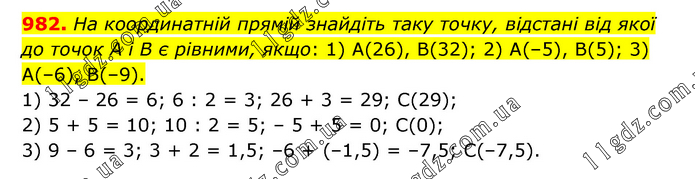 На координатній прямій знайдіть таку точку, відстані від якої до точок А і В є рівними, якщо: 1) А(26), В(32); 2) А(–5), В(5); 3) А(–6), В(–9). 1) 32 – 26 = 6; 6 : 2 = 3; 26 + 3 = 29; C(29); 2) 5 + 5 = 10; 10 : 2 = 5; – 5 + 5 = 0; C(0); 3) 9 – 6 = 3; 3 + 2 = 1,5; –6 + (–1,5) = –7,5; C(–7,5).