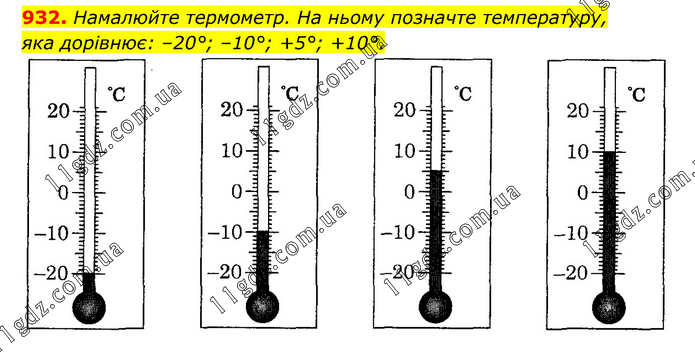 Намалюйте термометр. На ньому позначте температуру, яка дорівнює: –20°; –10°; +5°; +10°.