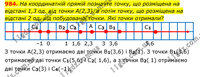 На координатній прямій позначте точку, що розміщена на відстані 1,3 од. від точки А(2,3), а потім точку, що розміщена на відстані 2 од. від побудованої точки. Які точки отримали? З точки А(2,3) отримаємо дві точки B1(3,6) і В2(1). З точки В1(3,6) отримаємо дві точки С1(5,6) і С2( 1,6), а з точки В2( 1) отримаємо дві точки С3(3) і С4(–1).