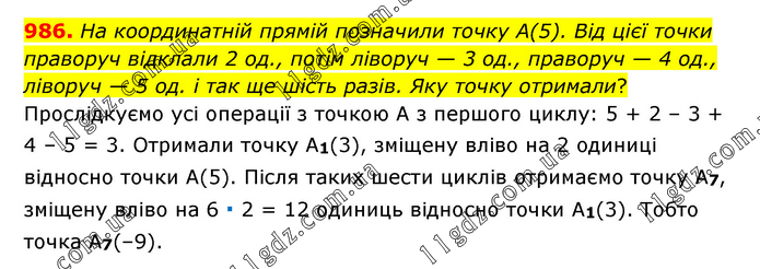 На координатній прямій позначили точку А(5). Від цієї точки праворуч відклали 2 од., потім ліворуч — 3 од., праворуч — 4 од., ліворуч — 5 од. і так ще шість разів. Яку точку отримали? Прослідкуємо усі операції з точкою А з першого циклу: 5 + 2 – 3 + 4 – 5 = 3. Отримали точку A1(3), зміщену вліво на 2 одиниці відносно точки А(5). Після таких шести циклів отримаємо точку А7, зміщену вліво на 6 ∙ 2 = 12 одиниць відносно точки A1(3). Тобто точка А7(–9).