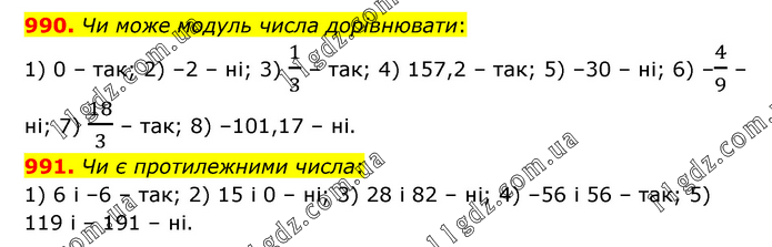 990. Чи може модуль числа дорівнювати: 1) 0 – так; 2) –2 – ні; 3) 1/3 – так; 4) 157,2 – так; 5) –30 – ні; 6) –4/9 – ні; 7) 18/3 – так; 8) –101,17 – ні. 991. Чи є протилежними числа: 1) 6 і –6 – так; 2) 15 і 0 – ні; 3) 28 і 82 – ні; 4) –56 і 56 – так; 5) 119 і – 191 – ні.