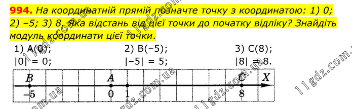 На координатній прямій позначте точку з координатою: 1) 0; 2) –5; 3) 8. Яка відстань від цієї точки до початку відліку? Знайдіть модуль координати цієї точки. 1) А(0); 2) В(–5); 3) С(8); |0| = 0; |–5| = 5; |8| = 8.