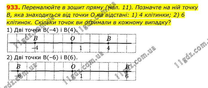 Перемалюйте в зошит пряму (мал. 11). Позначте на ній точку В, яка знаходиться від точки O на відстані: 1) 4 клітинки; 2) 6 клітинок. Скільки точок ви отримали в кожному випадку? 1) Дві точки В(–4) і В(4). 2) Дві точки В(–6) і В(6).