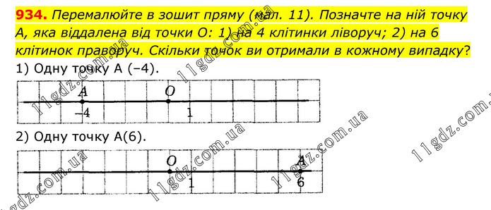 Перемалюйте в зошит пряму (мал. 11). Позначте на ній точку А, яка віддалена від точки О: 1) на 4 клітинки ліворуч; 2) на 6 клітинок праворуч. Скільки точок ви отримали в кожному випадку? 1) Одну точку А (–4). 2) Одну точку А(6).