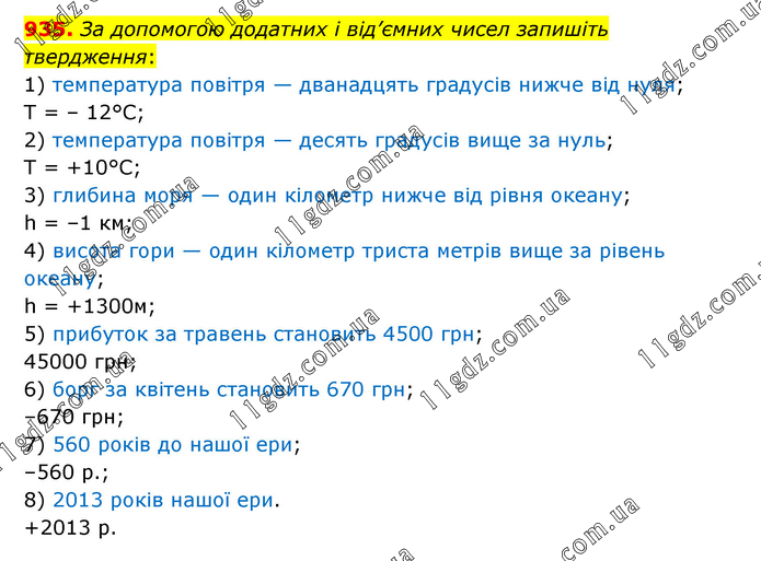 За допомогою додатних і від’ємних чисел запишіть твердження: 1) температура повітря — дванадцять градусів нижче від нуля; Т = – 12°С; 2) температура повітря — десять градусів вище за нуль; Т = +10°С; 3) глибина моря — один кілометр нижче від рівня океану; h = –1 км; 4) висота гори — один кілометр триста метрів вище за рівень океану; h = +1300м; 5) прибуток за травень становить 4500 грн; 45000 грн; 6) борг за квітень становить 670 грн; –670 грн; 7) 560 років до нашої ери; –560 p.; 8) 2013 років нашої ери. +2013 p.