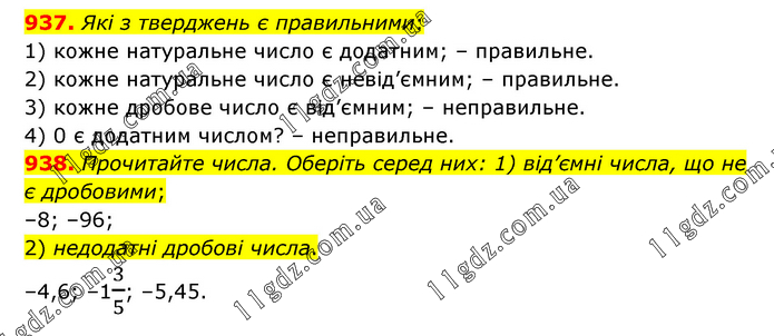 937. Які з тверджень є правильними: 1) кожне натуральне число є додатним; – правильне. 2) кожне натуральне число є невід’ємним; – правильне. 3) кожне дробове число є від’ємним; – неправильне. 4) 0 є додатним числом? – неправильне. 938. Прочитайте числа. Оберіть серед них: 1) від’ємні числа, що не є дробовими; –8; –96; 2) недодатні дробові числа. –4,6; –13/5; –5,45.