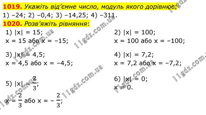 1019. Укажіть від’ємне число, модуль якого дорівнює: 1) –24; 2) –0,4; 3) –14,25; 4) –311. 1020. Розв’яжіть рівняння: 1) |х| = 15; х = 15 або х = –15; 2) |х| = 100; х = 100 або х = –100; 3) |х| = 4,5; х = 4,5 або х = –4,5; 4) |х| = 7,2; х = 7,2 або х = –7,2; 5) |х| = 2/3; х = 2/3 або х = – 2/3; 6) |х| = 0; х = 0.