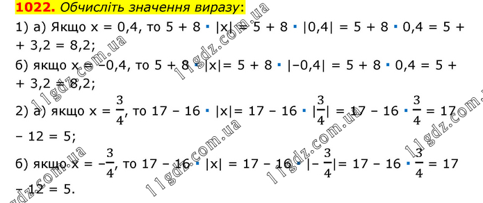 Обчисліть значення виразу: 1) а) Якщо х = 0,4, то 5 + 8 ∙ |х| = 5 + 8 ∙ |0,4| = 5 + 8 ∙ 0,4 = 5 + + 3,2 = 8,2; б) якщо х = –0,4, то 5 + 8 ∙ |х|= 5 + 8 ∙ |–0,4| = 5 + 8 ∙ 0,4 = 5 + + 3,2 = 8,2; 2) а) якщо х = 3/4, то 17 – 16 ∙ |х|= 17 – 16 ∙ |3/4| = 17 – 16 ∙ 3/4 = 17 – 12 = 5; б) якщо х = –3/4, то 17 – 16 ∙ |х| = 17 – 16 ∙ |– 3/4|= 17 – 16 ∙ 3/4 = 17 – 12 = 5.
