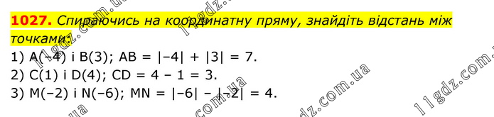 Спираючись на координатну пряму, знайдіть відстань між точками: 1) А(–4) і В(3); АВ = |–4| + |3| = 7. 2) C(1) і D(4); CD = 4 – 1 = 3. 3) M(–2) і N(–6); MN = |–6| – |–2| = 4.