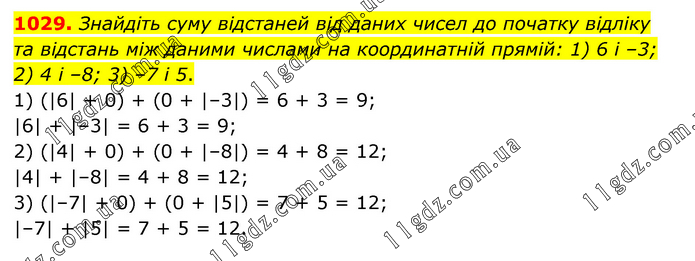 Знайдіть суму відстаней від даних чисел до початку відліку та відстань між даними числами на координатній прямій: 1) 6 і –3; 2) 4 і –8; 3) –7 і 5. 1) (|6| + 0) + (0 + |–3|) = 6 + 3 = 9; |6| + |–3| = 6 + 3 = 9; 2) (|4| + 0) + (0 + |–8|) = 4 + 8 = 12; |4| + |–8| = 4 + 8 = 12; 3) (|–7| + 0) + (0 + |5|) = 7 + 5 = 12; |–7| + |5| = 7 + 5 = 12.