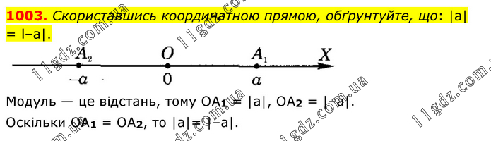 Скориставшись координатною прямою, обґрунтуйте, що: |a| = l–a|. Модуль — це відстань, тому ОА1 = |а|, ОА2 = |–а|. Оскільки ОА1 = ОА2, то |а|= |–а|.