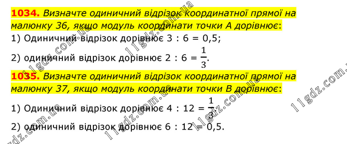 1034. Визначте одиничний відрізок координатної прямої на малюнку 36, якщо модуль координати точки А дорівнює: 1) Одиничний відрізок дорівнює 3 : 6 = 0,5; 2) одиничний відрізок дорівнює 2 : 6 = 1/3. 1035. Визначте одиничний відрізок координатної прямої на малюнку 37, якщо модуль координати точки В дорівнює: 1) Одиничний відрізок дорівнює 4 : 12 = 1/3. 2) одиничний відрізок дорівнює 6 : 12 = 0,5.