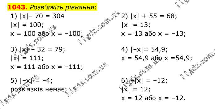 Розв’яжіть рівняння: 1) |х|– 70 = 304 |х| = 100; х = 100 або х = –100; 2) |х| + 55 = 68; |х| = 13; х = 13 або х = –13; 3) |х| – 32 = 79; |х| = 111; х = 111 або х = –111; 4) |–х|= 54,9; х = 54,9 або х =54,9; 5) |–х| = –4; розв’язків немає; 6) –|х| = –12; |х| = 12; х = 12 або х = –12.