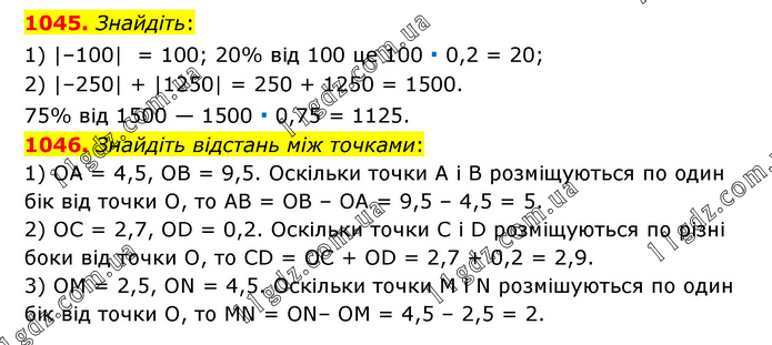 1045. Знайдіть: 1) |–100| = 100; 20% від 100 це 100 ∙ 0,2 = 20; 2) |–250| + |1250| = 250 + 1250 = 1500. 75% від 1500 — 1500 ∙ 0,75 = 1125. 1046. Знайдіть відстань між точками: 1) ОА = 4,5, ОВ = 9,5. Оскільки точки А і В розміщуються по один бік від точки О, то АВ = ОВ – ОА = 9,5 – 4,5 = 5. 2) ОС = 2,7, OD = 0,2. Оскільки точки С і D розміщуються по різні боки від точки О, то CD = ОС + OD = 2,7 + 0,2 = 2,9. 3) ОМ = 2,5, ON = 4,5. Оскільки точки М і N розмішуються по один бік від точки О, то MN = ON– ОМ = 4,5 – 2,5 = 2.