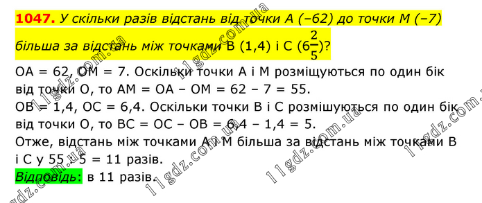 У скільки разів відстань від точки А (–62) до точки M (–7) більша за відстань між точками В (1,4) і C (62/5)? ОА = 62, ОМ = 7. Оскільки точки А і М розміщуються по один бік від точки О, то АМ = ОА – ОМ = 62 – 7 = 55. ОВ = 1,4, ОС = 6,4. Оскільки точки В і С розмішуються по один бік від точки О, то ВС = ОС – ОВ = 6,4 – 1,4 = 5. Отже, відстань між точками А і М більша за відстань між точками В і С у 55 : 5 = 11 разів. Відповідь: в 11 разів.