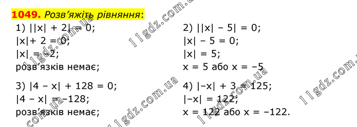 Розв’яжіть рівняння: 1) ||х| + 2| = 0; |х|+ 2 = 0; |х| = –2; розв’язків немає; 2) ||х| – 5| = 0; |х| – 5 = 0; |х| = 5; х = 5 або х = –5 3) |4 – х| + 128 = 0; |4 – х| = –128; розв’язків немає; 4) |–х| + 3 = 125; |–х| = 122; х = 122 або х = –122.