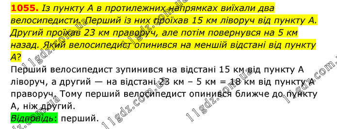 Із пункту А в протилежних напрямках виїхали два велосипедисти. Перший із них проїхав 15 км ліворуч від пункту А. Другий проїхав 23 км праворуч, але потім повернувся на 5 км назад. Який велосипедист опинився на меншій відстані від пункту А? Перший велосипедист зупинився на відстані 15 км від пункту А ліворуч, а другий — на відстані 23 км – 5 км = 18 км від пункту А праворуч. Тому перший велосипедист опинився ближче до пункту А, ніж другий. Відповідь: перший.