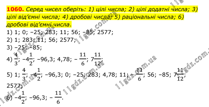 Серед чисел оберіть: 1) цілі числа; 2) цілі додатні числа; 3) цілі від’ємні числа; 4) дробові числа; 5) раціональні числа; 6) дробові від’ємні числа. 1) 1; 0; –25; 283; 11; 56; –85; 2577; 2) 1; 283; 11; 56; 2577; 3) –25; –85; 4) 4/3; –41/2; –96,3; 4,78; – 11/6; 711/12; 5) 1; 4/3; –41/2; –96,3; 0; –25; 283; 4,78; 11; – 11/6; 56; –85; 711/12; 2577; 6) –41/2; –96,3; – 11/6.