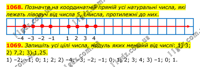 1068. Позначте на координатній прямій усі натуральні числа, які лежать ліворуч від числа 5, і числа, протилежні до них. 1069. Запишіть усі цілі числа, модуль яких менший від числі: 1) 3; 2) 7,2; 3) 1,25. 1) –2; –1; 0; 1; 2; 2) –4; –3; –2; –1; 0; 1; 2; 3; 4; 3) –1; 0; 1.