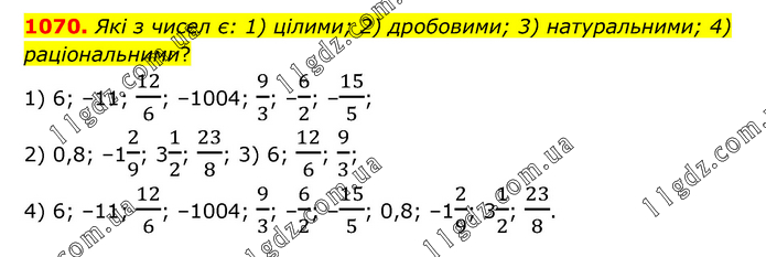 Які з чисел є: 1) цілими; 2) дробовими; 3) натуральними; 4) раціональними? 1) 6; –11; 12/6; –1004; 9/3; –6/2; –15/5; 2) 0,8; –12/9; 31/2; 23/8; 3) 6; 12/6; 9/3; 4) 6; –11; 12/6; –1004; 9/3; –6/2; –15/5; 0,8; –12/9; 31/2; 23/8.