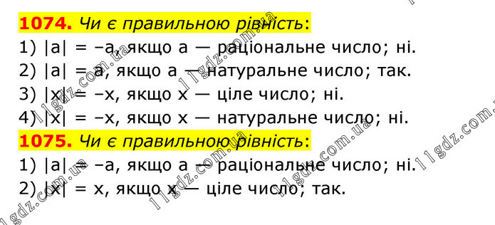 1074. Чи є правильною рівність: 1) |а| = –а, якщо а — раціональне число; ні. 2) |а| = а, якщо а — натуральне число; так. 3) |х| = –х, якщо х — ціле число; ні. 4) |х| = –х, якщо х — натуральне число; ні. 1075. Чи є правильною рівність: 1) |a| = –a, якщо а — раціональне число; ні. 2) |x| = х, якщо х — ціле число; так.