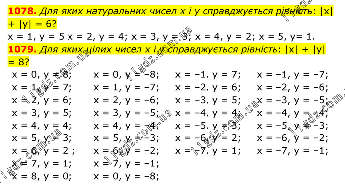 1078. Для яких натуральних чисел х і у справджується рівність: |х| + |у| = 6? х = 1, у = 5 х = 2, у = 4; х = 3, у = 3; х = 4, у = 2; х = 5, у= 1. 1079. Для яких цілих чисел х і у справджується рівність: |х| + |у| = 8? х = 0, у = 8; х = 1, у = 7; х = 2, у = 6; х = 3, у = 5; х = 4, у = 4; х = 5, у = 3; х = 6, у = 2 ; х = 7, у = 1; х = 8, у = 0; х = 0, у = –8; х = 1, у = –7; х = 2, у = –6; х = 3, у = –5; х = 4, у = –4; х = 5, у = –3; х = 6, у = –2; х = 7, у = –1; х = 0, у = –8; х = –1, у = 7; х = –2, у = 6; х = –3, у = 5; х = –4, у = 4; х = –5, у = 3; х = –6, у = 2; х = –7, у = 1; х = –1, у = –7; х = –2, у = –6; х = –3, у = –5; х = –4, у = –4; х = –5, у = –3; х = –6, у = –2; х = –7, у = –1;