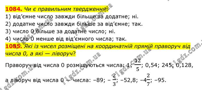 1084. Чи є правильним твердження: 1) від’ємне число завжди більше за додатне; ні. 2) додатне число завжди більше за від’ємне; так. 3) число 0 більше за додатне число; ні. 4) число 0 менше від від’ємного числа; так. 1085. Які із чисел розміщені на координатній прямій праворуч від числа 0, а які — ліворуч? Праворуч від числа 0 розмішуються числа: 1; 12/5; 0,54; 245; 0,128, а ліворуч від числа 0 — числа: –89; – 2/3; –52,8; –42/7; –95.