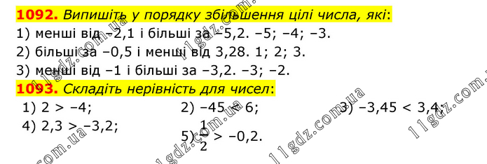 1092. Випишіть у порядку збільшення цілі числа, які: 1) менші від –2,1 і більші за –5,2. –5; –4; –3. 2) більші за –0,5 і менші від 3,28. 1; 2; 3. 3) менші від –1 і більші за –3,2. –3; –2. 1093. Складіть нерівність для чисел: 1) 2 > –4; 2) –45 < 6; 3) –3,45 < 3,4; 4) 2,3 > –3,2; 5) 1/2 > –0,2.