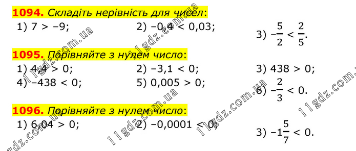 1094. Складіть нерівність для чисел: 1) 7 > –9; 2) –0,4 < 0,03; 3) –5/2 < 2/5. 1095. Порівняйте з нулем число: 1) 4,4 > 0; 2) –3,1 < 0; 3) 438 > 0; 4) –438 < 0; 5) 0,005 > 0; 6) –2/3 < 0. 1096. Порівняйте з нулем число: 1) 6,04 > 0; 2) –0,0001 < 0; 3) –15/7 < 0.