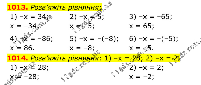 1013. Розв’яжіть рівняння: 1) –х = 34; х = –34; 2) –х = 5; х = –5; 3) –х = –65; х = 65; 4) –х = –86; х = 86. 5) –х = –(–8); х = –8; 6) –х = –(–5); х = –5. 1014. Розв’яжіть рівняння: 1) –х = 28; 2) –х = 2. 1) –х = 28; х = –28; 2) –х = 2; х = –2;