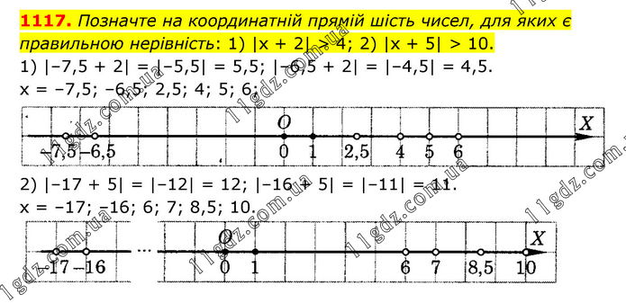 Позначте на координатній прямій шість чисел, для яких є правильною нерівність: 1) |x + 2| > 4; 2) |х + 5| > 10. 1) |–7,5 + 2| = |–5,5| = 5,5; |–6,5 + 2| = |–4,5| = 4,5. х = –7,5; –6,5; 2,5; 4; 5; 6; 2) |–17 + 5| = |–12| = 12; |–16 + 5| = |–11| = 11. х = –17; –16; 6; 7; 8,5; 10.