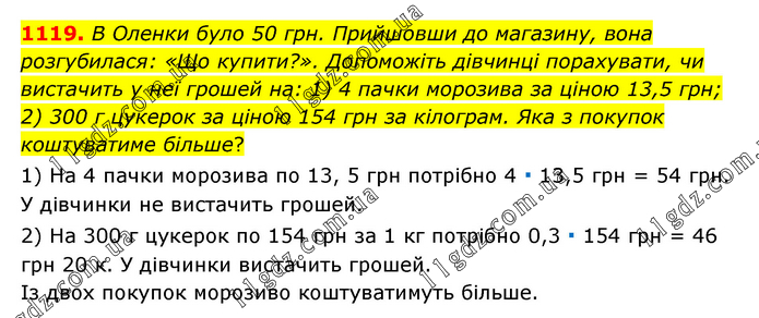 В Оленки було 50 грн. Прийшовши до магазину, вона розгубилася: «Що купити?». Допоможіть дівчинці порахувати, чи вистачить у неї грошей на: 1) 4 пачки морозива за ціною 13,5 грн; 2) 300 г цукерок за ціною 154 грн за кілограм. Яка з покупок коштуватиме більше? 1) На 4 пачки морозива по 13, 5 грн потрібно 4 ∙ 13,5 грн = 54 грн. У дівчинки не вистачить грошей. 2) На 300 г цукерок по 154 грн за 1 кг потрібно 0,3 ∙ 154 грн = 46 грн 20 к. У дівчинки вистачить грошей. Із двох покупок морозиво коштуватимуть більше.