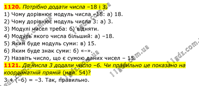 1120. Потрібно додати числа –18 і 3. 1) Чому дорівнює модуль числа –18: а) 18. 2) Чому дорівнює модуль числа 3: а) 3. 3) Модулі чисел треба: б) відняти. 4) Модуль якого числа більший: а) –18. 5) Яким буде модуль суми: в) 15. 6) Яким буде знак суми: б) «–». 7) Назвіть число, що є сумою даних чисел – 15. 1121. До числа 3 додали число –6. Чи правильно це показано на координатній прямій (мал. 54)? 3 + (–6) = –3. Так, правильно.