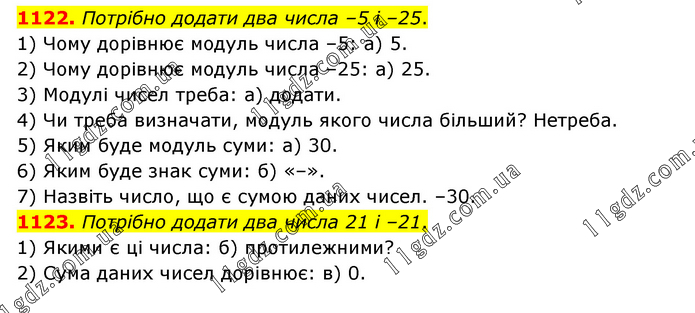 1122. Потрібно додати два числа –5 і –25. 1) Чому дорівнює модуль числа –5: а) 5. 2) Чому дорівнює модуль числа –25: а) 25. 3) Модулі чисел треба: а) додати. 4) Чи треба визначати, модуль якого числа більший? Нетреба. 5) Яким буде модуль суми: а) 30. 6) Яким буде знак суми: б) «–». 7) Назвіть число, що є сумою даних чисел. –30. 1123. Потрібно додати два числа 21 і –21. 1) Якими є ці числа: б) протилежними? 2) Сума даних чисел дорівнює: в) 0.
