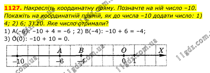 Накресліть координатну пряму. Позначте на ній число –10. Покажіть на координатній прямій, як до числа –10 додати число: 1) 4; 2) 6; 3) 10. Яке число отримали? 1) А(–6): –10 + 4 = –6 ; 2) В(–4): –10 + 6 = –4; 3) О(0): –10 + 10 = 0.