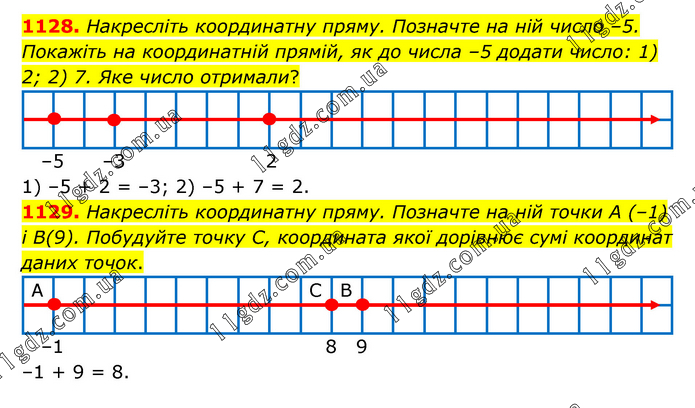 Накресліть координатну пряму. Позначте на ній число –5. Покажіть на координатній прямій, як до числа –5 додати число: 1) 2; 2) 7. Яке число отримали? 1) –5 + 2 = –3; 2) –5 + 7 = 2. 1129. Накресліть координатну пряму. Позначте на ній точки А (–1) і В(9). Побудуйте точку С, координата якої дорівнює сумі координат даних точок. –1 + 9 = 8.