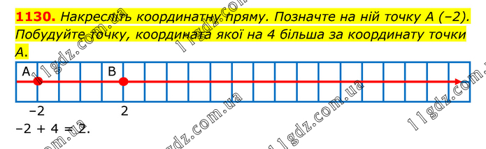 Накресліть координатну пряму. Позначте на ній точку А (–2). Побудуйте точку, координата якої на 4 більша за координату точки А. –2 + 4 = 2.