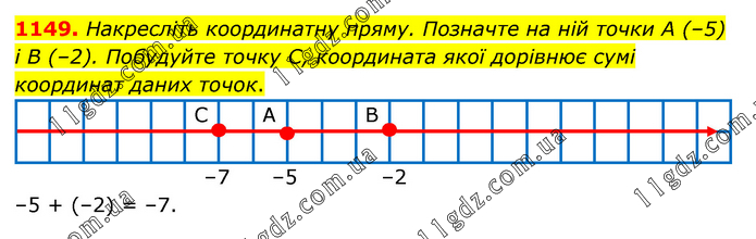 Накресліть координатну пряму. Позначте на ній точки А (–5) і В (–2). Побудуйте точку С, координата якої дорівнює сумі координат даних точок. –5 + (–2) = –7.