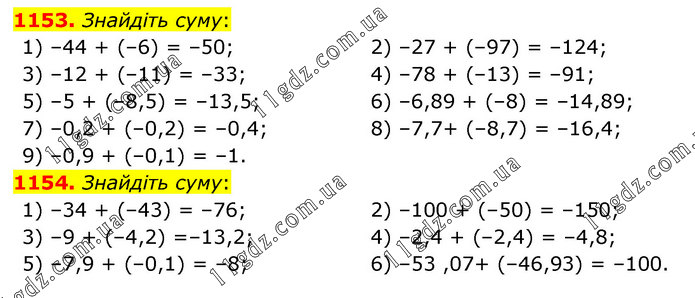 1153. Знайдіть суму: 1) –44 + (–6) = –50; 2) –27 + (–97) = –124; 3) –12 + (–11) = –33; 4) –78 + (–13) = –91; 5) –5 + (–8,5) = –13,5; 6) –6,89 + (–8) = –14,89; 7) –0,2 + (–0,2) = –0,4; 8) –7,7+ (–8,7) = –16,4; 9) –0,9 + (–0,1) = –1. 1154. Знайдіть суму: 1) –34 + (–43) = –76; 2) –100 + (–50) = –150; 3) –9 + (–4,2) =–13,2; 4) –2,4 + (–2,4) = –4,8; 5) –7,9 + (–0,1) = –8; 6) –53 ,07+ (–46,93) = –100.