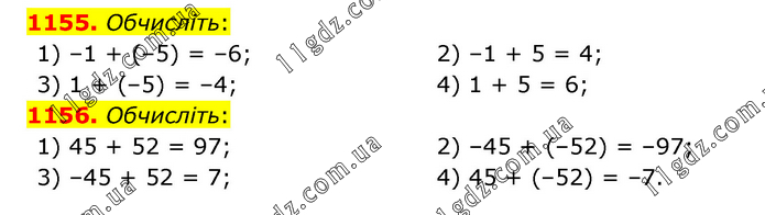 1155. Обчисліть: 1) –1 + (–5) = –6; 2) –1 + 5 = 4; 3) 1 + (–5) = –4; 4) 1 + 5 = 6; 1156. Обчисліть: 1) 45 + 52 = 97; 2) –45 + (–52) = –97; 3) –45 + 52 = 7; 4) 45 + (–52) = –7.
