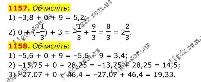 1157. Обчисліть: 1) –3,8 + 0 + 9 = 5,2; 2) 0 + (–1/3) + 3 = –1/3 + 9/3 = 8/3 = 22/3. 1158. Обчисліть: 1) –5,6 + 0 + 9 = –5,6 + 9 = 3,4; 2) –13,75 + 0 + 28,25 = –13,75 + 28,25 = 14,5; 3) –27,07 + 0 + 46,4 = –27,07 + 46,4 = 19,33.