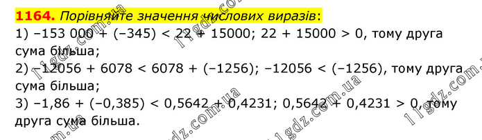 Порівняйте значення числових виразів: 1) –153 000 + (–345) < 22 + 15000; 22 + 15000 > 0, тому друга сума більша; 2) –12056 + 6078 < 6078 + (–1256); –12056 < (–1256), тому друга сума більша; 3) –1,86 + (–0,385) < 0,5642 + 0,4231; 0,5642 + 0,4231 > 0, тому друга сума більша.